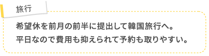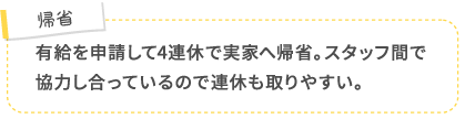 基本的にシフトはグループリーダーが決めますが、有休を除いて、月に4回までシフトの希望を出す事ができます。「この日は誕生日会があるから早番がいい」とか「旅行に行きたいから希望休と有休を合わせる」とか、スケジュールに合わせて調整できます。また、遅番の翌日が早番だとオフの時間が短くなってしまうので、なるべく遅番の翌日が早番にならないよう調整してくれます。